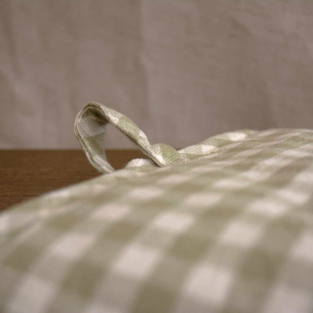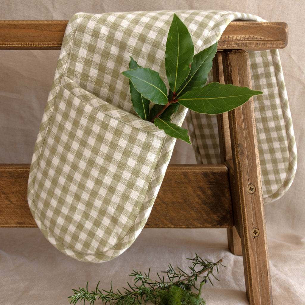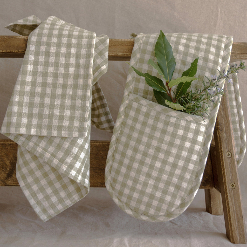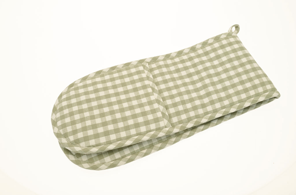 This double oven glove comes in a gorgeous sage green and white check . They are part of our Gingham Collection where you will find tea towels , a gorgeous runner with matching napkins to elevate your table setting.