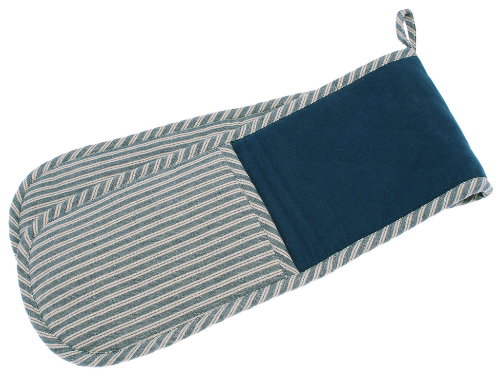 This double oven glove comes in a gorgeous denim blue white . They are part of our Hampton Collection where you will find tea towels , a gorgeous runner with matching napkins to elevate your table setting.